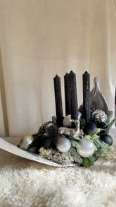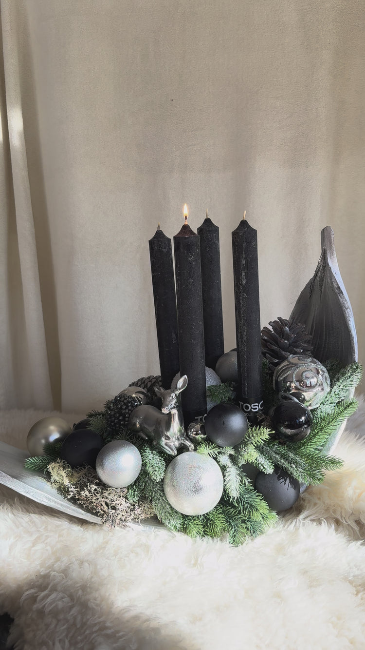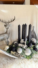 Dieser außergewöhnliche Adventskranz kombiniert tiefschwarze Stabkerzen mit edlen Dekoelementen in Silber, Matt-Schwarz und Metallic-Grau. Frisches Tannengrün, strukturierte Zapfen, Moosdetails und eine elegante silberne Hirschfigur verleihen dem Arrangement eine moderne, festliche und luxuriöse Ausstrahlung. Ein stilvoller Hingucker für alle, die Weihnachten in einem extravaganten, glamourösen Look feiern möchten.