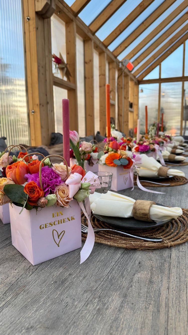 Dieses farbenfrohe und fröhliche Gesteck bringt pure Lebensfreude und zaubert garantiert ein Lächeln ins Gesicht. Perfekt als kleines Geschenk für den Valentinstag – ein Ausdruck von Liebe und guter Laune!