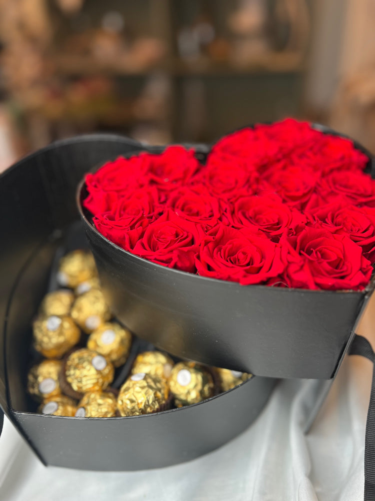 Wunderschöne kräftig rote Forever Rosen strahlen in der schwarzen Box um die Wette. Die darunter liegenden Ferrero Rocher runden das ganze farblich ab und sorgen zugleich für den Nachtisch.