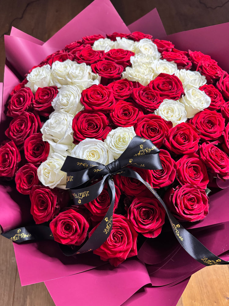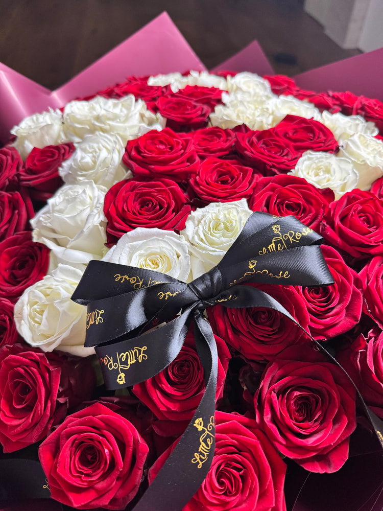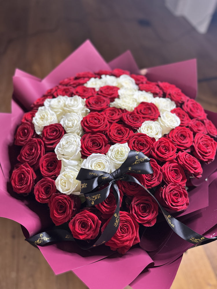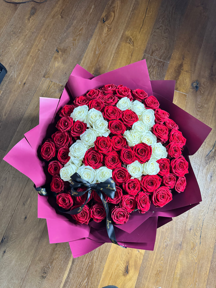 Dieser exklusive Strauß besteht aus 70 sorgfältig ausgewählten Blumen, formiert in einem eleganten Arrangement mit roten und weißen Akzenten. Ein zeitloser Klassiker, der Eleganz und Romantik vereint.