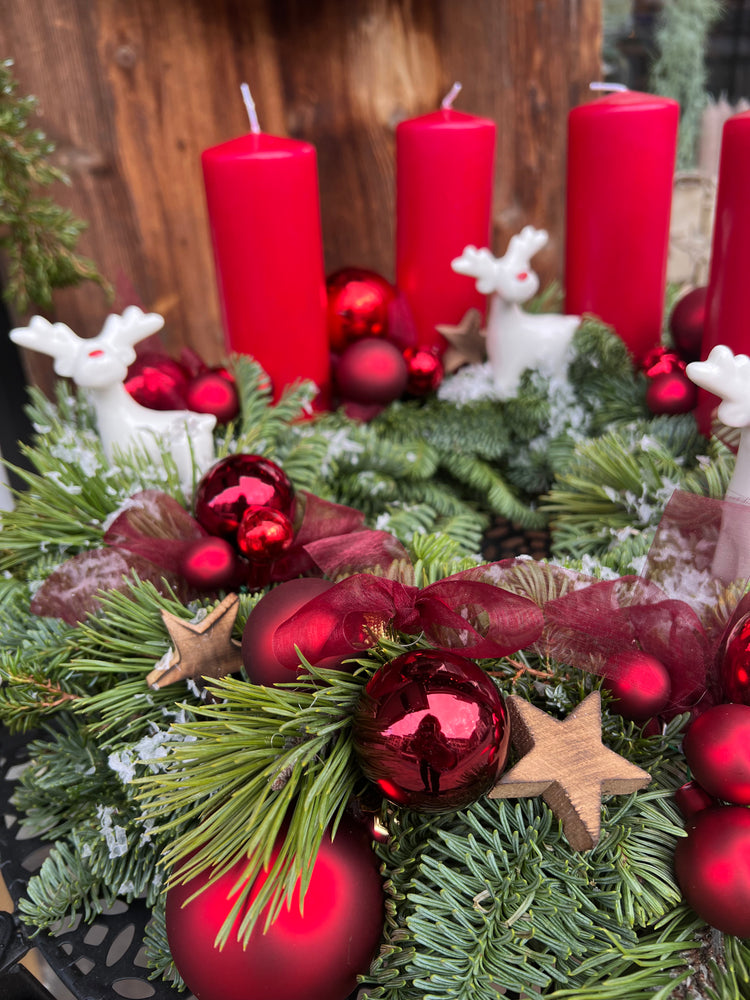 Unser klassischer roter Adventskranz bringt die festliche Stimmung direkt in Ihr Zuhause.