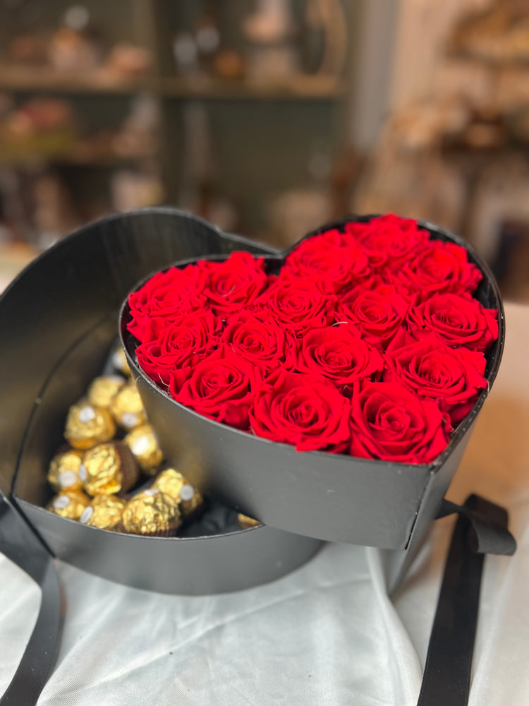 Wunderschöne kräftig rote Forever Rosen strahlen in der schwarzen Box um die Wette. Die darunter liegenden Ferrero Rocher runden das ganze farblich ab und sorgen zugleich für den Nachtisch.